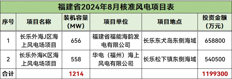 8月份,福建共計核準2個風電項目,總規模1214MW,總投資1199300萬元,均為海上風電項目。