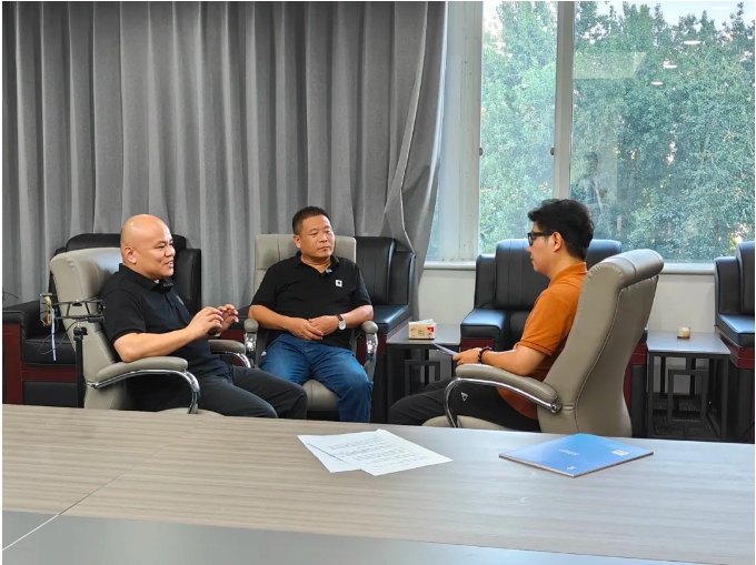 涂料采購網(wǎng)大V(右)專訪立幸邦董事副總經(jīng)理羅峰(左)及銷售副總經(jīng)理李強(中)