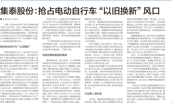 近期,《推動電動自行車以舊換新實施方案》正式印發(fā)。近日,中國證券報記者采訪集泰股份(或稱公司)董事兼總經理鄒珍凡了解到,近年來,公司積極拓展新能源膠領域,已經擁有較為完善的電動自行車電池用膠解決方案。公司將緊抓電動自行車“以舊換新”機遇,大力拓展新能源膠市場。