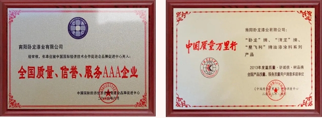 臥龍涂料憑借卓越的品質和服務獲得全國質量、信譽、服務AAA企業,“十三五”高質量發展企業,省科技進步獎,優秀新產品獎等多項榮譽,董事長李國報曾獲國務院認定的“功勛企業家”榮譽稱號。