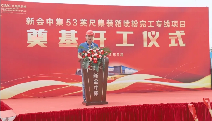 隨后,新會中集總經理戴志前先生代表公司發表了講話。戴總指出,綠色發展是企業未來的核心戰略之一,而此次建設的53英尺集裝箱噴粉完工專線,正是新會中集踐行綠色制造承諾的重要舉措。我們堅信環境保護是企業發展的永恒主題,持續在綠色化生產領域創新突破,將大規模應用集裝箱整箱粉末涂裝技術,并兼容多種集裝箱產品生產,進一步提升了公司在綠色“智造”方面的競爭力。綠色發展的腳步不會停歇,未來新會中集還將繼續踐行環保責任,推動綠色“智造”。