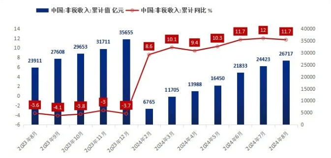 同比往年數據而言,2024年1-8月的非稅收入創歷史同期最高值。今年上半年,非稅收入規模已經高于2014年全年規模。在上半年公布數據的15個省份中,北京、天津、山西、貴州等13個省份非稅收入占比同比上升。其中,福建非稅收入占比達到42.3%,接近“半壁江山”。
