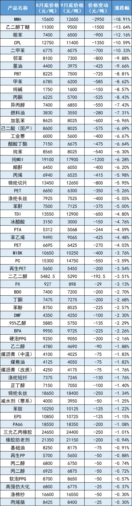事實上,正如眾多化工人所預期的,今年的“金九”旺季失約了。下游訂單冷淡的基礎上,化工品的售價也進入了下滑通道。據涂料采購網不完全統計,截至9月末,已有60余種化工品價格較8月末環比下滑。這其中包括溶劑類的乙二醇丁醚、二甲苯、甲苯、丙酮、異丙醇、醋酸丁酯,基礎原材料類的MMA、粗苯、純堿、MDI、純苯、TDI、PTA、苯乙烯、BDO,以及下游類的PA66、PP、EPS、PET、PC、PBT等,價格下滑高達近3000元/噸,跌幅也接近了20%左右。