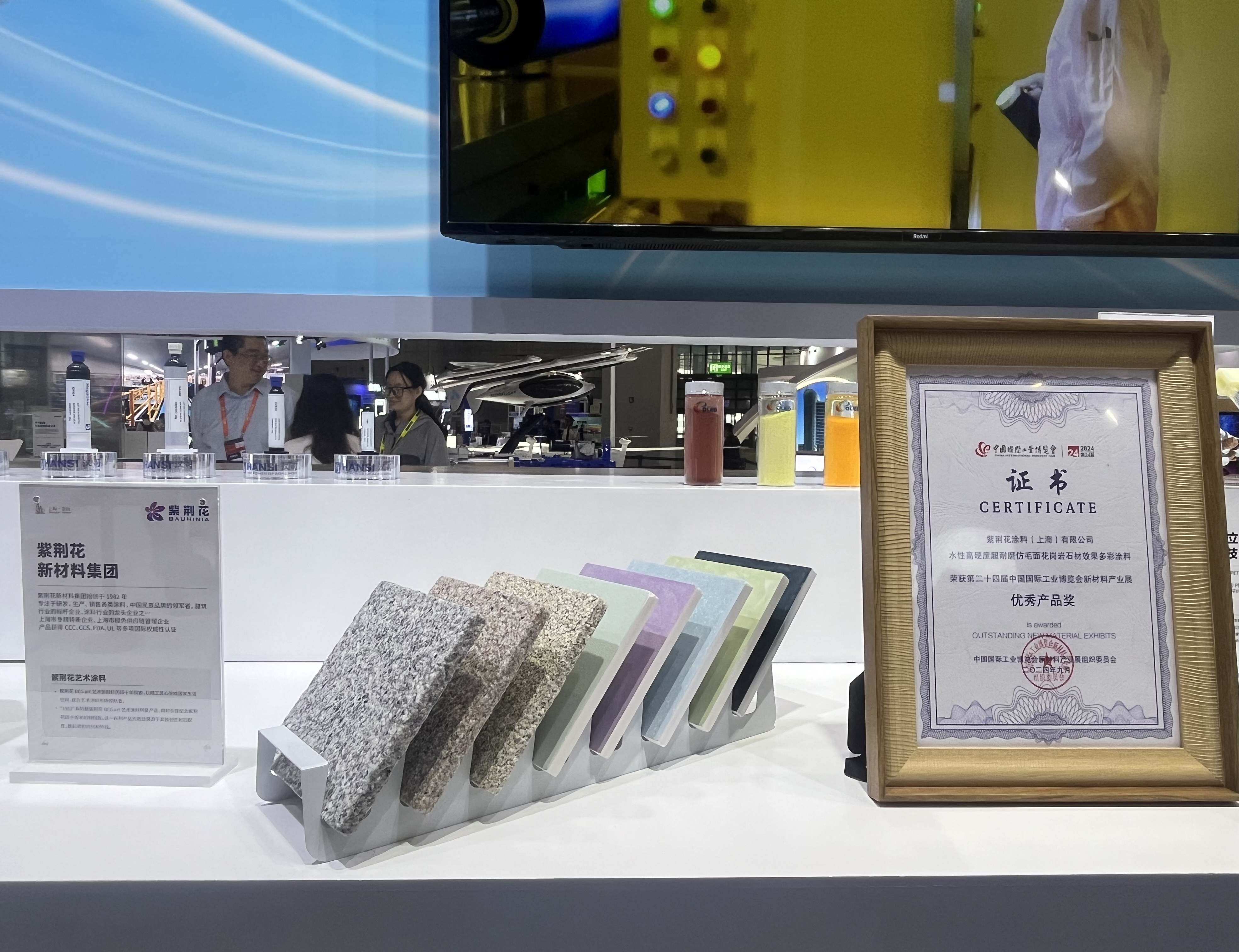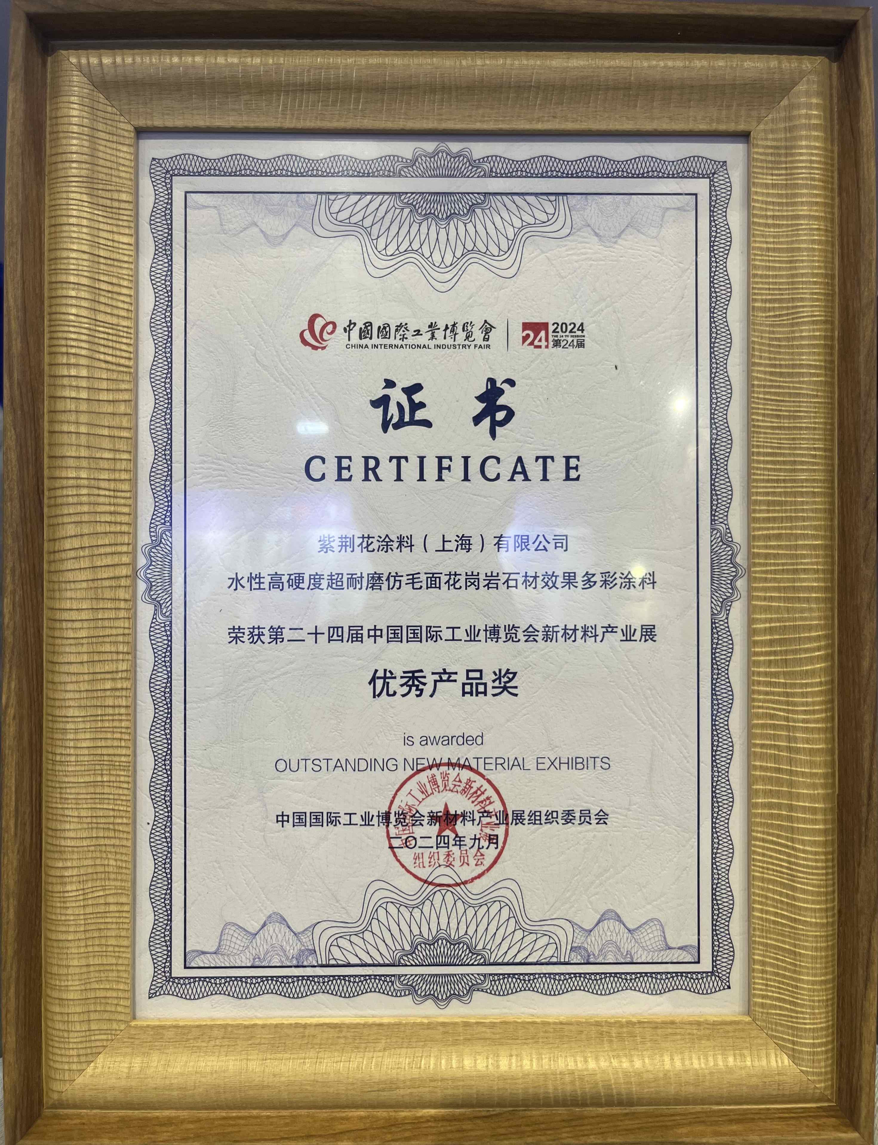 在展會同期舉辦的2024中國國際工業(yè)博覽會新材料產(chǎn)業(yè)發(fā)展高峰論壇上,紫荊花更憑借“水性高硬度超耐磨仿毛面花崗巖石材效果多彩涂料”這一國家發(fā)明專利技術(shù)產(chǎn)品,榮獲第二十四屆中國國際工業(yè)博覽會新材料產(chǎn)業(yè)展優(yōu)秀產(chǎn)品獎!