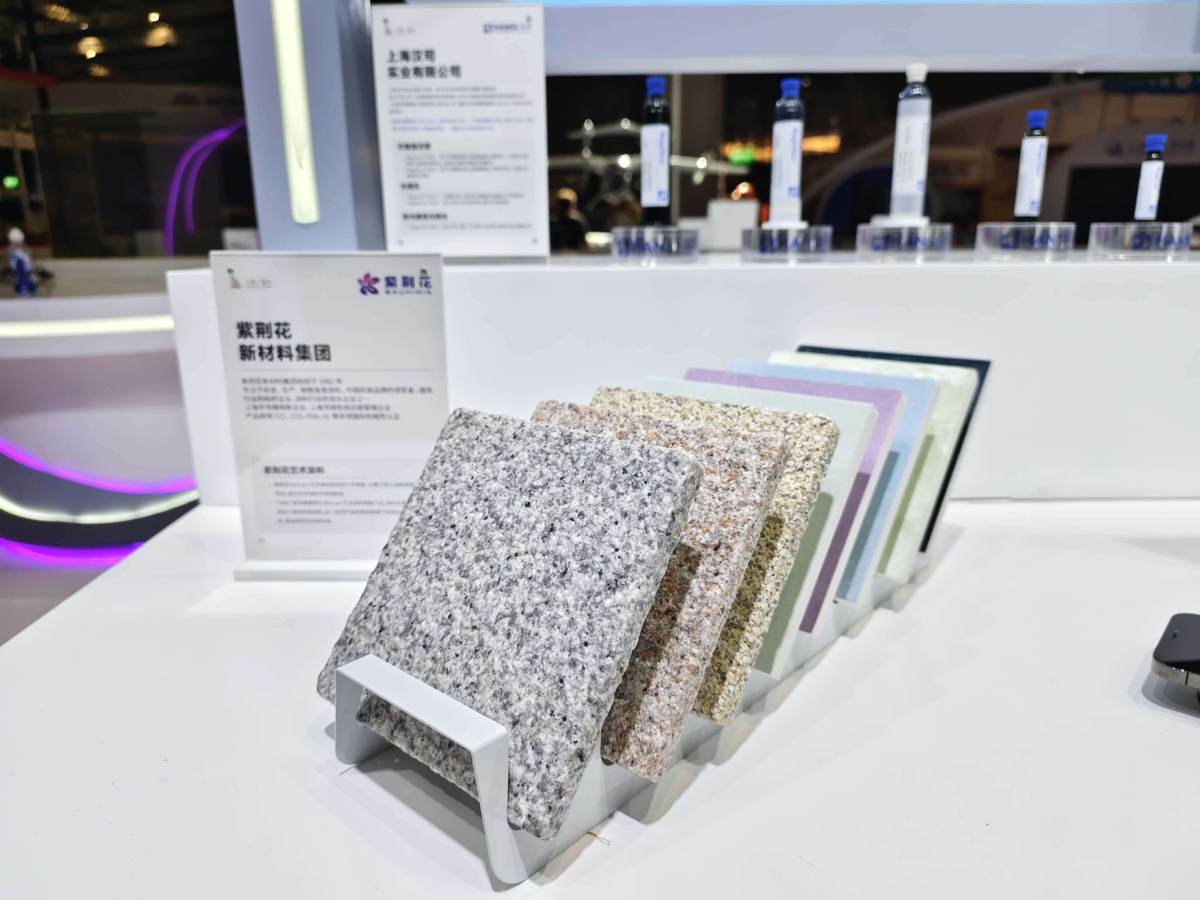 作為金山區(qū)優(yōu)秀企業(yè)代表,紫荊花與其他金山區(qū)知名企業(yè),共同亮相位于國家會展中心7.2H館的“上海灣區(qū) 智造金山”主題展位,重點展示了紫荊花仿石多彩涂料和紫荊花BCG藝術(shù)涂料兩大優(yōu)勢產(chǎn)品系列。