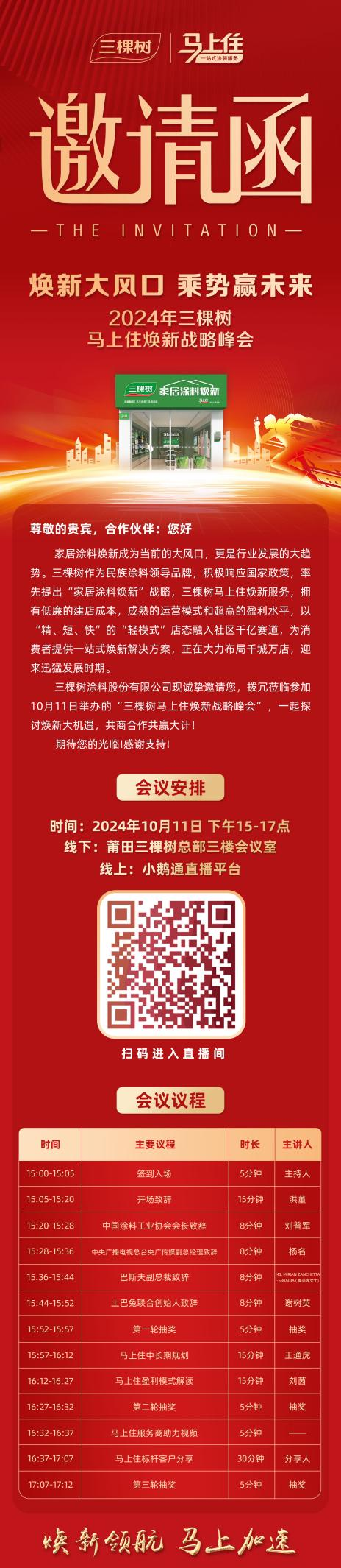 家居涂料煥新成為當前的大風口,引領著行業(yè)的未來方向。在這個充滿機遇與挑戰(zhàn)的時刻,三棵樹作為中國民族涂料的領軍品牌,將于10月11日隆重舉辦“三棵樹馬上住煥新戰(zhàn)略峰會”(以下簡稱峰會)。此次峰會不僅是對家居涂料煥新戰(zhàn)略的深度探討,更是與行業(yè)同仁攜手共進、共謀發(fā)展的重要契機。