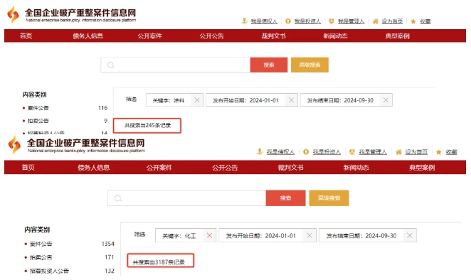 據(jù)全國(guó)企業(yè)破產(chǎn)重整案件信息網(wǎng)數(shù)據(jù),今年前三季度,涂料企業(yè)破產(chǎn)重整案件共245條記錄。化工行業(yè)顯然出現(xiàn)了更為驚悚的數(shù)據(jù):今年內(nèi)破產(chǎn)重整的共3187條。這還僅僅是關(guān)鍵字為涂料、化工的企業(yè),如果把經(jīng)銷(xiāo)商、貿(mào)易商以及一些銷(xiāo)售小店都算進(jìn)來(lái)的話,數(shù)據(jù)將更為觸目驚心。