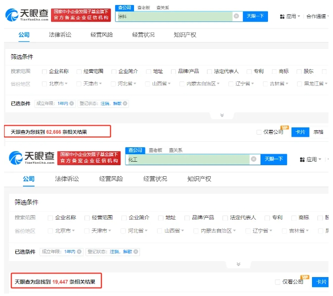 相比于進(jìn)入破產(chǎn)重整階段,但還有希望從頭再來(lái)的企業(yè)而言,還有不少涂料化工企業(yè)徹底結(jié)束了“生命”,注銷(xiāo)或解散了多年苦心經(jīng)營(yíng)的工廠。這些企業(yè)遍布大江南北,有些已經(jīng)成立了幾十年,變成知名的老廠;有些則是看好了行情進(jìn)場(chǎng),準(zhǔn)備撈金,曾經(jīng)大張旗鼓開(kāi)工的場(chǎng)面還歷歷在目,就因多種原因選擇退出。數(shù)據(jù)顯示,成立一年內(nèi)且注銷(xiāo)或解散的涂料企業(yè)超過(guò)6萬(wàn)家,化工企業(yè)近2萬(wàn)家,合計(jì)約8.2萬(wàn)家。