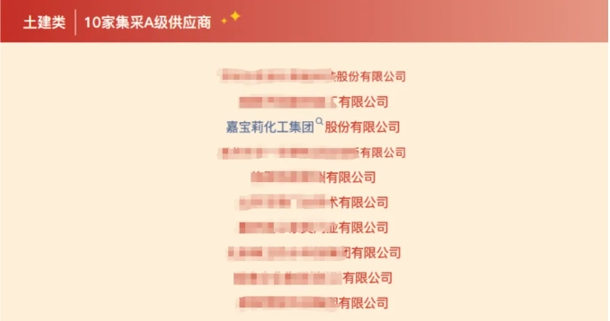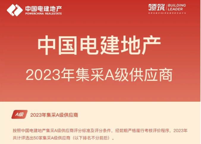 近期,中國電建地產對2023年優秀供應商進行評選,按照中國電建地產集采A級供應商評分標準及評分條件,經前期嚴格履行考核評價程序,共計評出50家2023年集采A級供應商。嘉寶莉地坪材料憑借高品質的產品體系、個性化的解決方案、專業的技術工藝、優質的服務體系,獲得央企中國電建地產認可,榮膺2023年度集采A級供應商稱號。