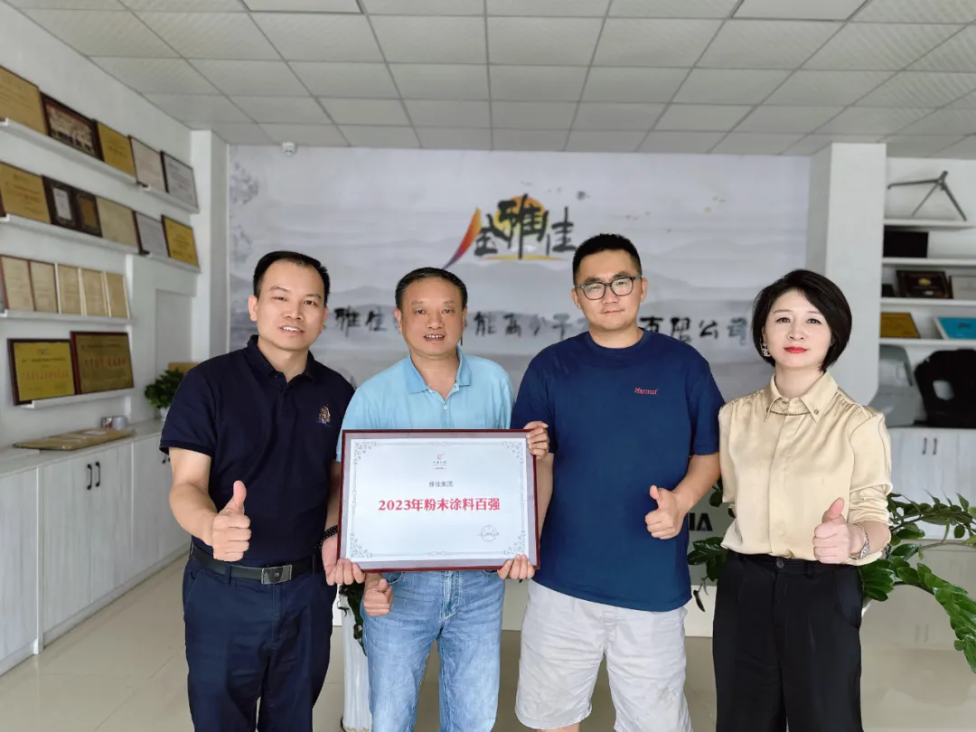 涂料采購網張馨元(右)到訪雅佳并頒發粉末銷量百強及粉末銷售額50強獎牌