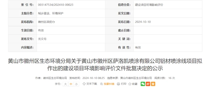 近日,黃山市徽州區(qū)生態(tài)環(huán)境分局發(fā)布關(guān)于黃山市徽州區(qū)薩洛凱噴涂有限公司鋁材噴涂線項(xiàng)目擬作出的建設(shè)項(xiàng)目環(huán)境影響評(píng)價(jià)文件批復(fù)決定的公示。