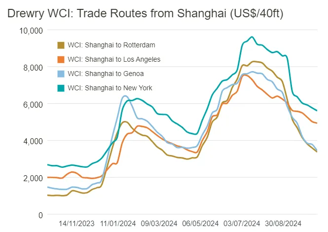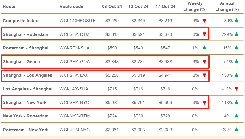 本周上海到熱那亞的運費下跌9%,跌346美元至每大箱3438美元;上海到鹿特丹的運費下降了6%,跌218美元至3373美元;上海到紐約的運費下跌3% ,跌152美元至5609美元;上海到洛杉磯的運價下降了2% ,跌78美元至4941美元。