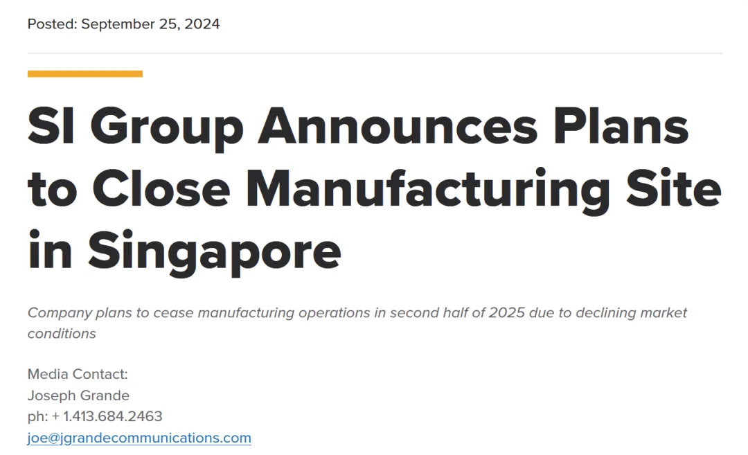 美國高性能添加劑、化學中間體企業圣萊科特國際集團(SI Group)宣布,計劃于2025年下半年關閉其在新加坡裕廊島的烷基酚制造工廠。