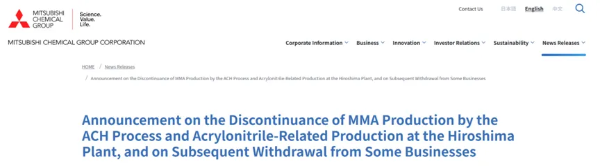 三菱化學集團將關停旗下廣島工廠的ACH工藝甲基丙烯酸甲酯(MMA)單體、丙烯腈及其衍生物(涉及螯合劑、乙腈和硫酸銨)產能,并撤銷螯合劑和乙腈業務。