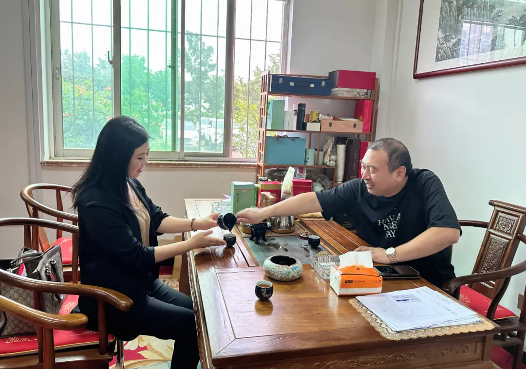 涂料采購網王賽(左)到訪煙臺歐冠,并與王總(右)溝通行情