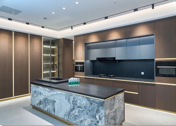 開放式廚房區(qū)融合金屬、奢石與木皮元素