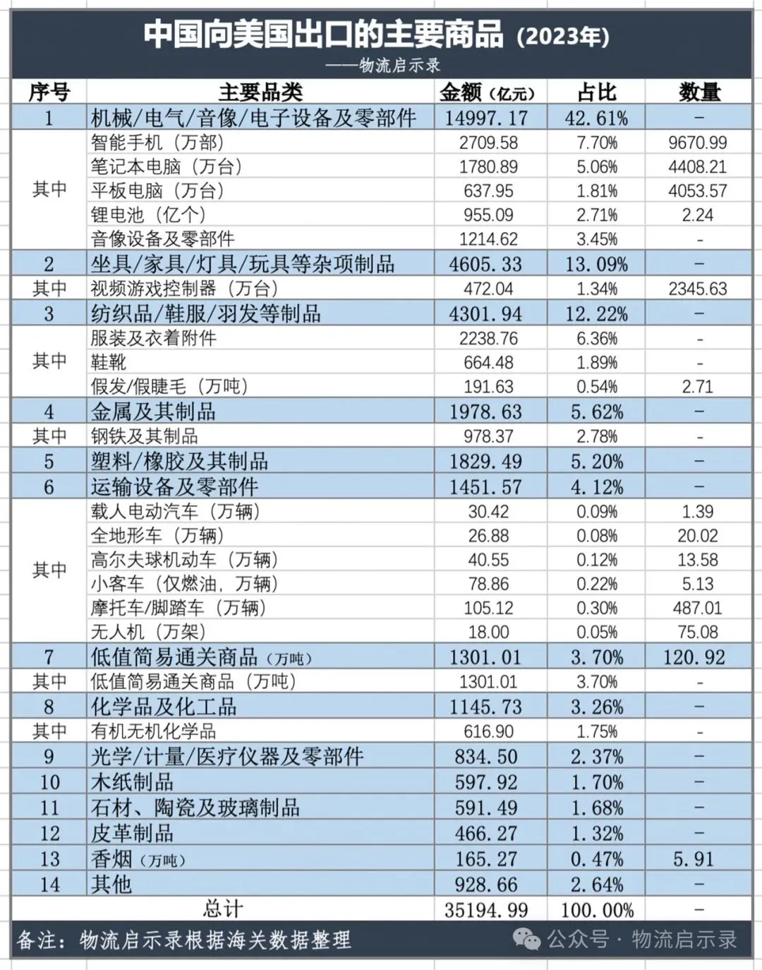 除此之外,化工下游行業領域的出口情況也并不樂觀,堪稱屢屢受挫。在2023年我國向美國出口最多的產品中,電腦手機鋰電池,紡織品服裝鞋帽、塑料橡膠、電動汽車、燃油客車、光學/醫療設備、皮革瓷磚等都有著較高的出口額,合計超過3萬億。其中機械/電氣/音像/電子設備及零部件,出口金額14997億元,占比42.61%。