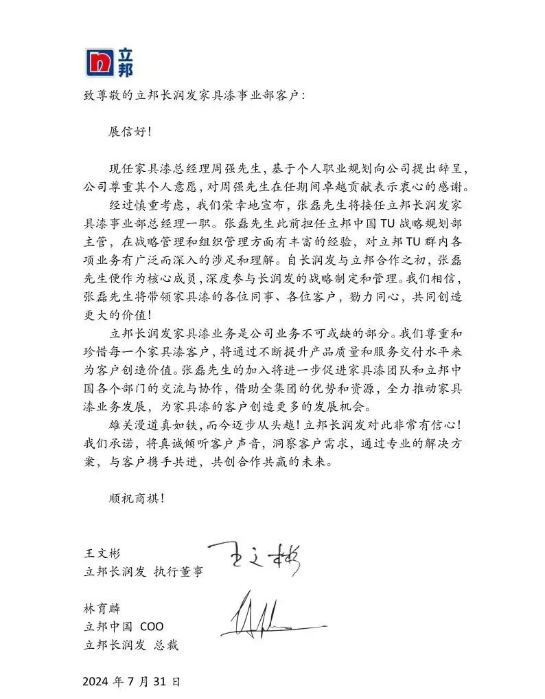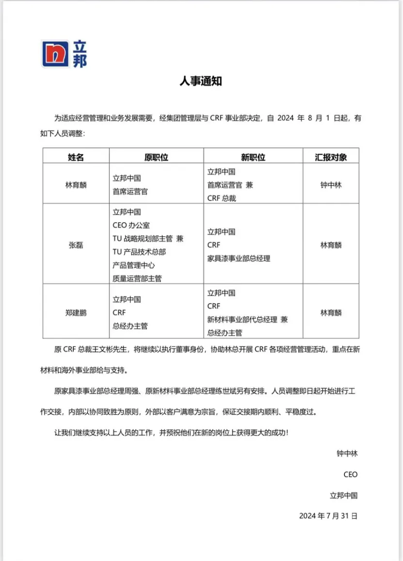 立邦中國宣布了一系列高層的人事變動,首席運營官林育麟被任命為立邦中國首席運營官兼CRF總裁;張磊晉升為立邦中國CRF家具漆事業部總經理,CRF總經辦主管鄭建鵬新職位是立邦中國CRF新材料事業部總經理兼總經辦主管。