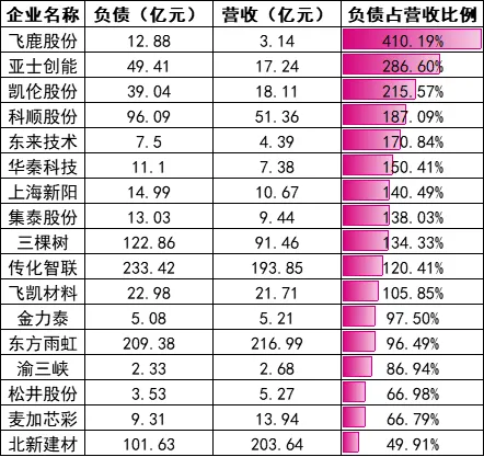 而細看涂料上市公司的負債數據則更為驚悚,部分涂料上市公司的負債高達100多億,遠比營業收入還要高。負債占營收的比例超過了100%,飛鹿股份甚至高達410%。這意味著千辛萬苦銷售入賬的錢還抵不上背負的債務,這也讓涂料企業的資金鏈面臨重重危機。
