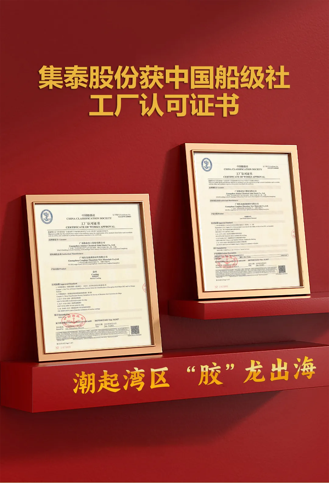 2023年3月和9月,集泰股份先后獲得密封膠類(低播焰材料)、船舶涂料類中國船級社工廠認可證書,充分展現了企業強大的制造實力與優異的產品性能。