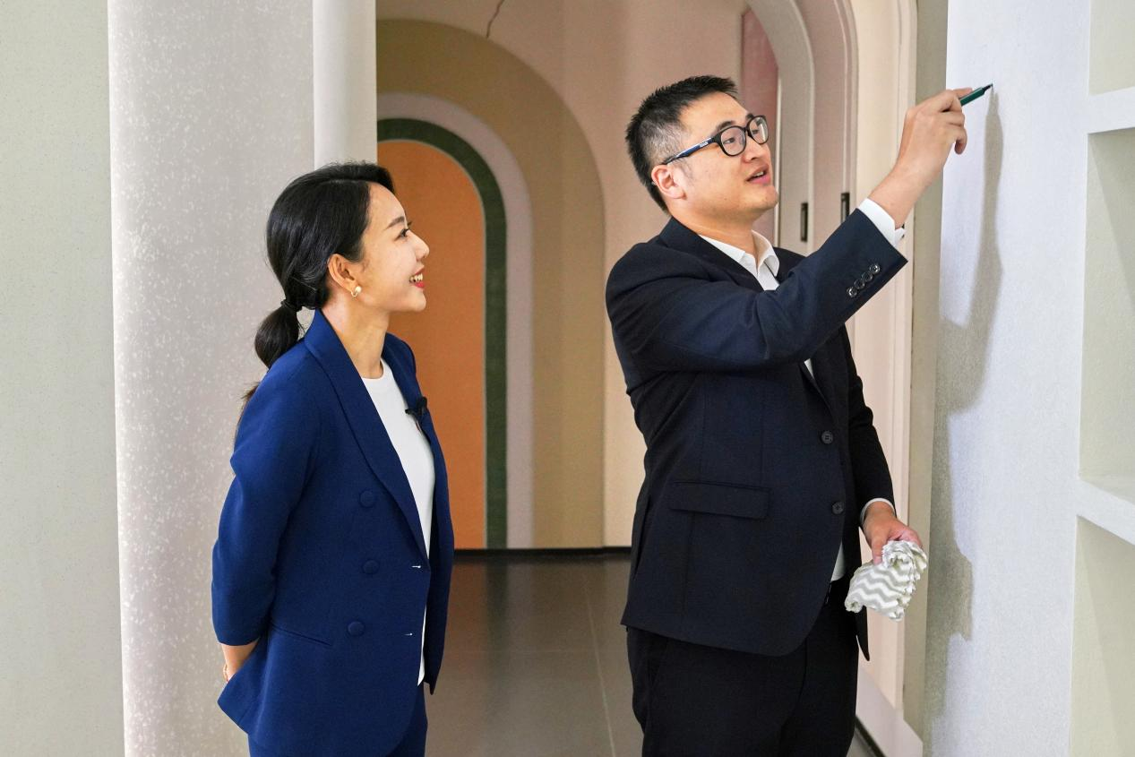 三棵樹副總裁洪圣源(右)向記者展示藝術(shù)漆墻面的可擦洗性