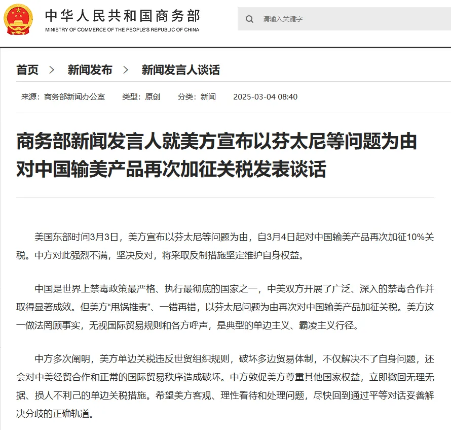 2025年3月3日,白宮鑒于芬太尼供應(yīng)鏈管控問題,將對中國加收關(guān)稅從10%提升至20%,自3月4日起生效,針對全品類。
