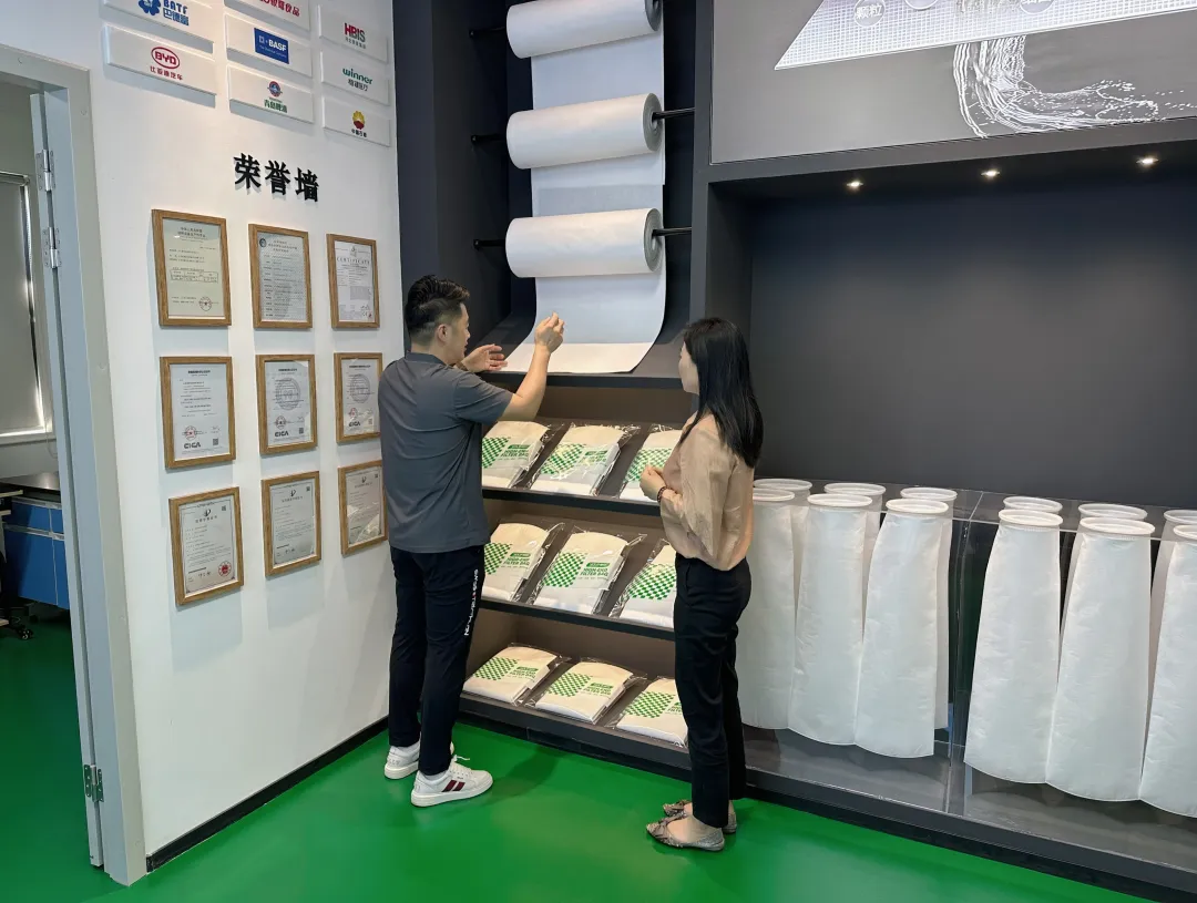 涂料采購網(wǎng)王賽(右)探訪雅特過濾,了解產(chǎn)品優(yōu)勢特色