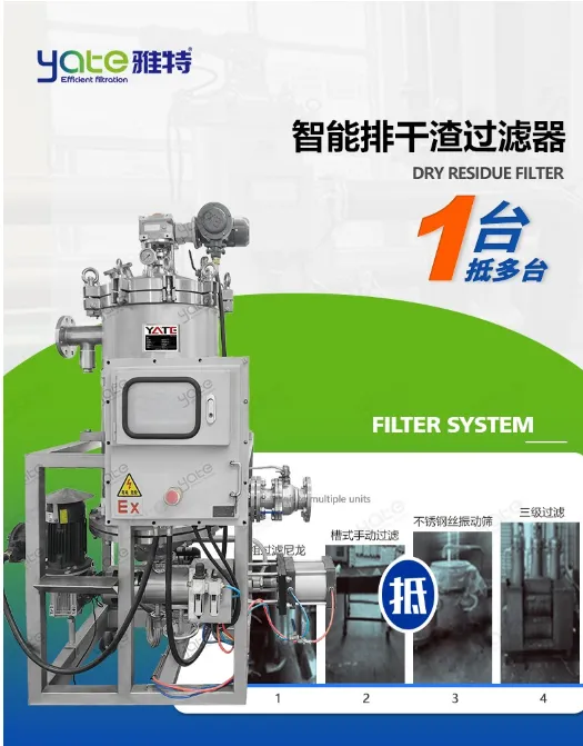 為了滿足這一趨勢,雅特過濾推出了排干渣過濾器,這款產(chǎn)品為涂料化工等行業(yè)帶來了全新的過濾體驗。排干渣過濾器采用獨特的設計,當原液進入過濾器后,會通過內(nèi)部濾網(wǎng)進行初步過濾,雜質(zhì)被截留在楔形網(wǎng)的內(nèi)表面。當待機時間達到預設值時,配備校正功能的螺旋式刮刀會緊貼濾元內(nèi)表面旋轉,高效刮除濾網(wǎng)上的雜質(zhì),刮落的雜質(zhì)隨后沉淀到集污倉。當集污倉內(nèi)的雜質(zhì)堆積量達到排渣要求時,系統(tǒng)便會自動開啟排渣程序。這一創(chuàng)新設計,使過濾器的過濾效率相較于傳統(tǒng)方式大幅提高40%,排出干渣的含水率也能控制在≤20%,極大地提升了資源利用率。