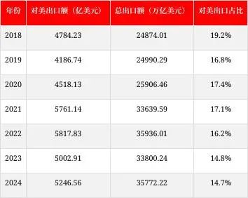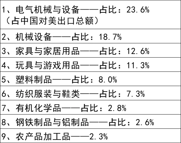 從2018年到2024年,中國(guó)對(duì)美出口占總出口的比例從19.2%下降到14.7%,這一變化主要受到中美貿(mào)易摩擦、美國(guó)加征關(guān)稅以及中國(guó)積極拓展其他海外市場(chǎng)等因素的影響。從2024年的數(shù)據(jù)來(lái)看,品類主要是工業(yè)化制造品,其中高附加值產(chǎn)品迅速增長(zhǎng),而傳統(tǒng)的家居、玩具等占比較低,且比例持續(xù)縮小。