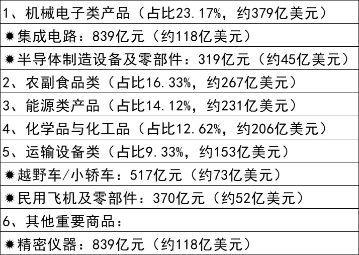 中國(guó)從美國(guó)進(jìn)口的商品結(jié)構(gòu)也較為多元,2024年中國(guó)對(duì)美國(guó)進(jìn)口了總價(jià)值11640億元人民幣(折合約1435億美元)的商品。農(nóng)產(chǎn)品、能源、機(jī)械電子為三大核心進(jìn)口領(lǐng)域。