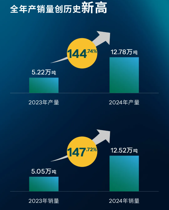 在關鍵財務指標上,麥加芯彩成績斐然。全年營業收入達到21.39億元,同比大幅增長87.56%,成功刷新了成立20多年來的歷史最高紀錄;歸屬于上市公司股東的凈利潤為2.11億元,同比增長26.30%,盈利能力穩步增強;產量和銷量分別提升至12.78萬噸與12.52萬噸,較2023年分別增長144.74%和147.72%,產量、銷量、營收三大核心指標均創歷史新高。這些亮眼的數據不僅彰顯了麥加芯彩過去一年的輝煌成就,也預示著其在未來市場競爭中充滿無限潛力,有望持續引領行業發展潮流,為行業的發展樹立新的標桿。