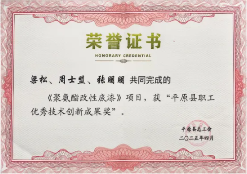 在核心技術攻堅領域,由梁松、周士盟、張朋朋組成的技術鐵三角領銜研發的《聚氨酯改性底漆》項目成功獲得平原縣總會評選的“平原縣職工優秀技術創新成果獎”。在榮譽加持與技術賦能的雙重驅動下,平原溫特正以每天誕生1.2項技術改進方案的創新速度,重新定義工業涂料的價值維度。從實驗室到生產線,從專利證書到行業標準,這家以創新為基因的企業,正在書寫中國涂料產業高質量發展的新范式。