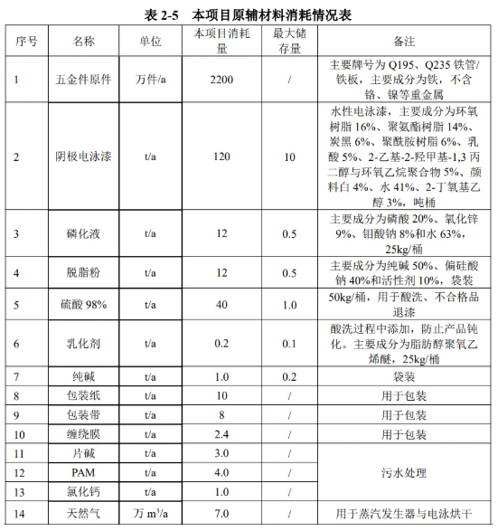 根據(jù)企業(yè)提供的資料,本項目電泳采用水性電泳漆,電泳漆固化后成膜厚度約0.1mm,干漆膜密度以1.25g/cm3計。電泳漆利用率以100%計,則本項目所需電泳漆固體份用量為55t/a。根據(jù)業(yè)主提供的電泳漆MSDS 資料,電泳漆固含量約55%,則理論上需要電泳漆100t/a,本項目電泳漆總用量為120t/a,可以匹配實際需求。