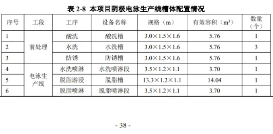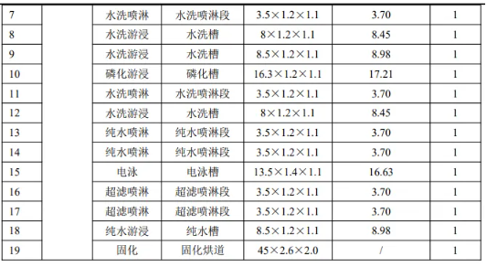 本項目配備全密閉、自動化電泳生產(chǎn)線,生產(chǎn)線槽體均架空敷設(shè),離地高度約 0.6m,生產(chǎn)線設(shè)置干濕分離。本項目電泳生產(chǎn)線槽體配置情況如下: