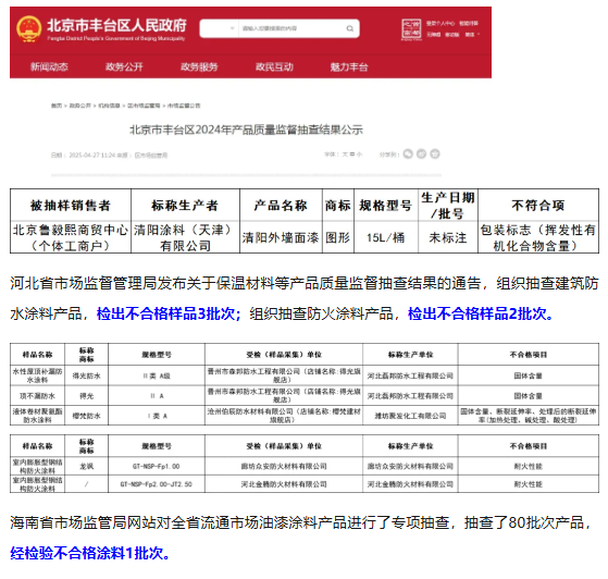 據(jù)涂料采購網(wǎng)了解,2025年短短幾個月的時間內(nèi),北京、河北、海南、四川、浙江、廣東、黑龍江、山東等十幾個省市地區(qū)公布了涂料產(chǎn)品抽查不合格的案例,200多家涂料企業(yè)登上“黑名單”,涉及的不合格項也是五花八門。