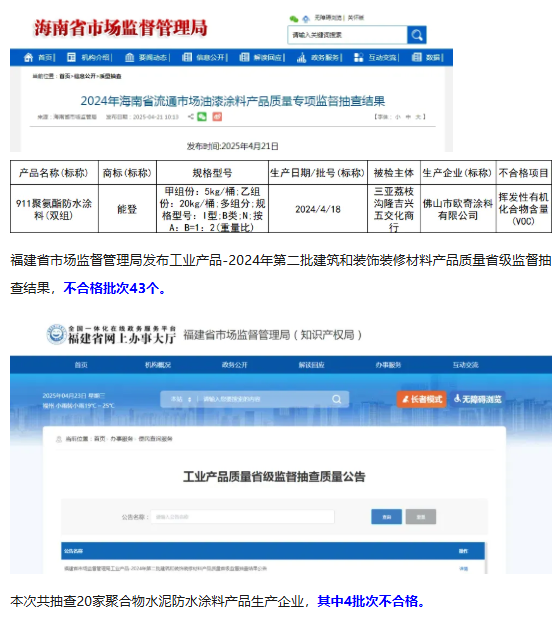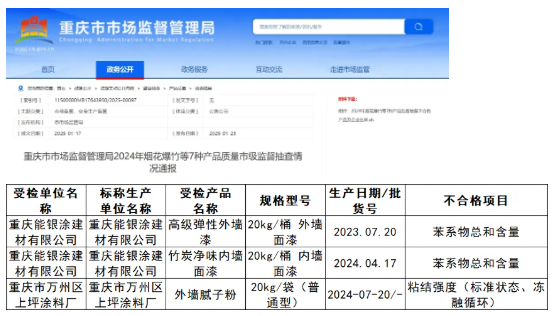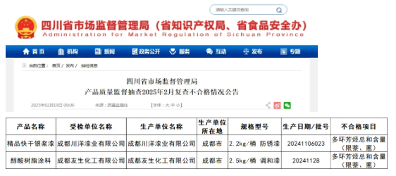 四川省市場監(jiān)督管理局發(fā)布產(chǎn)品質(zhì)量監(jiān)督抽查2025年2月復(fù)查不合格情況公告,涉及涂料2批次。