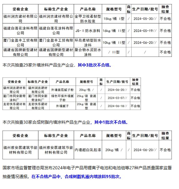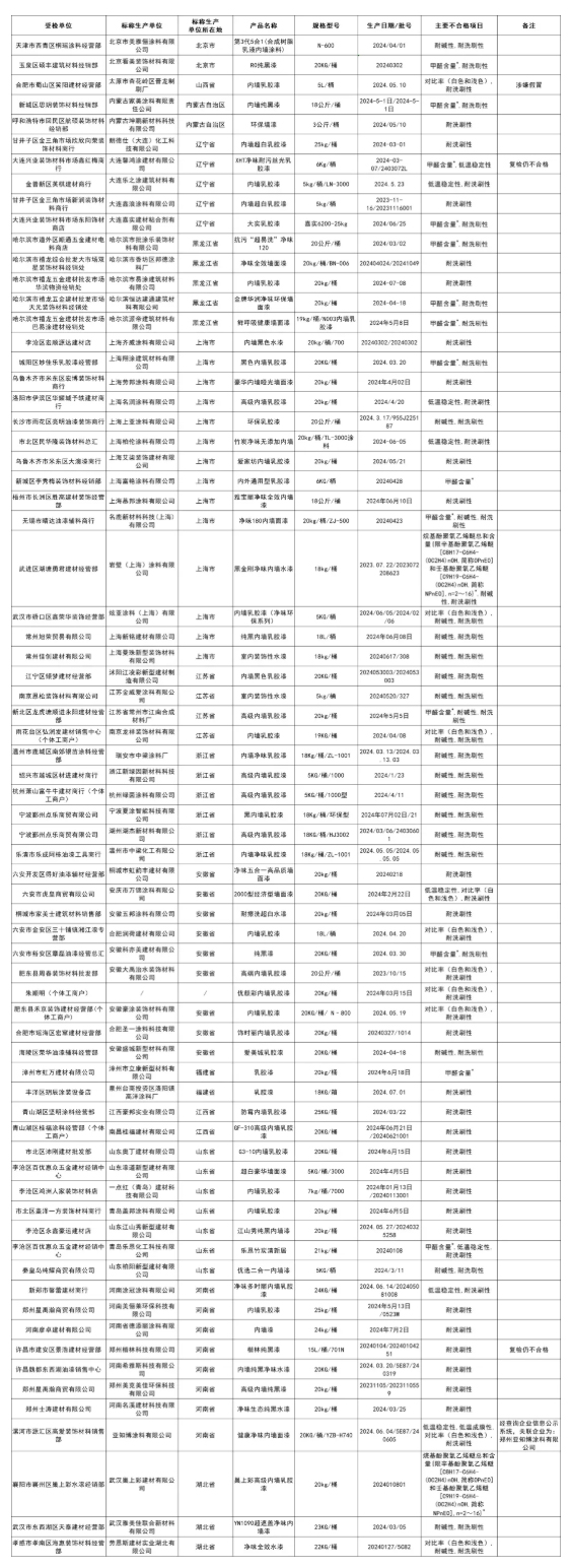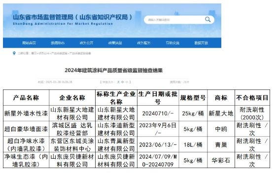 山東省市場監(jiān)管局公布2024年建筑涂料產(chǎn)品質(zhì)量省級監(jiān)督抽查結(jié)果,涉及4批次涂料不合格。