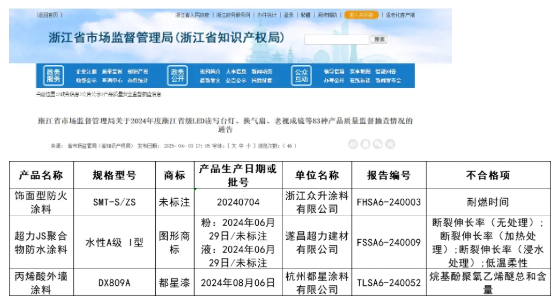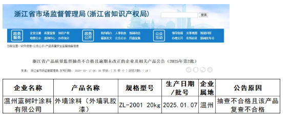 浙江省市場監(jiān)督管理局發(fā)布產(chǎn)品質(zhì)量監(jiān)督抽查不合格且逾期未改正的企業(yè)及相關(guān)產(chǎn)品公告(2025年第2批),涉及不合格涂料1批次。
