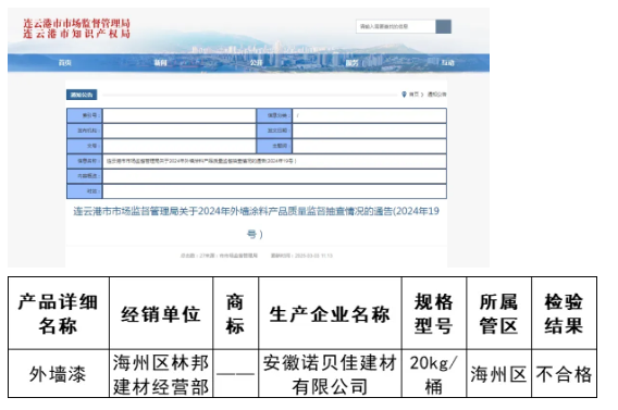 江蘇省連云港市市場監(jiān)督管理局發(fā)布關(guān)于2024年外墻涂料產(chǎn)品質(zhì)量監(jiān)督抽查情況的通告(2024年19號),1批次涂料不合格。