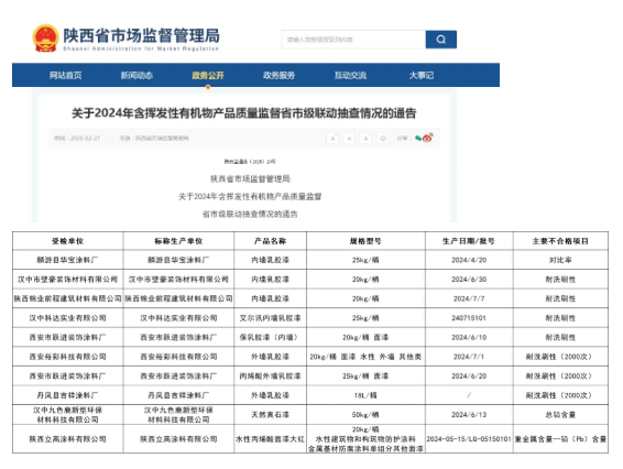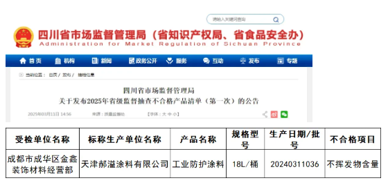 四川省市場監(jiān)督管理局發(fā)布2025年省級監(jiān)督抽查不合格產(chǎn)品清單(第一次),涉及1批次涂料不合格。