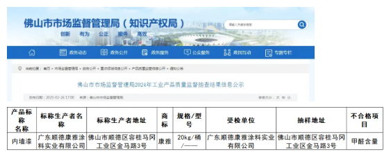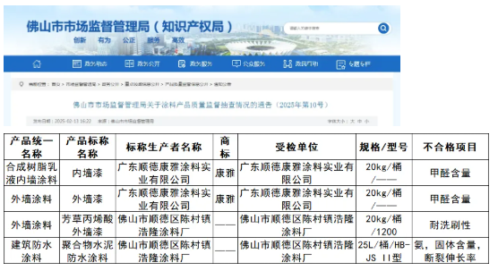 廣東省佛山市市場監(jiān)督管理局公示2024年工業(yè)產(chǎn)品質(zhì)量監(jiān)督抽查結(jié)果,1批次涂料不合格。