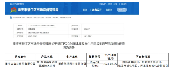 重慶市綦江區(qū)市場監(jiān)督管理局發(fā)布綦江區(qū)2024年兒童及學(xué)生用品等9類產(chǎn)品監(jiān)督抽查情況。本次區(qū)級監(jiān)督抽查99批次,不合格產(chǎn)品3批次,涉及涂料1批次。