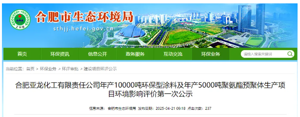 按照《中華人民共和國環境影響評價法》和《建設項目環境保護管理條例》,合肥亞龍化工有限責任公司委托合肥星灝原環境工程有限公司承擔“年產10000噸環保型涂料及年產5000噸聚氨酯預聚體生產項目”環境影響評價工作。按照《環境影響評價公眾參與辦法》(生態環境部部令第4號)的有關規定,對擬建項目環評工作進行第一次公示,內容如下: