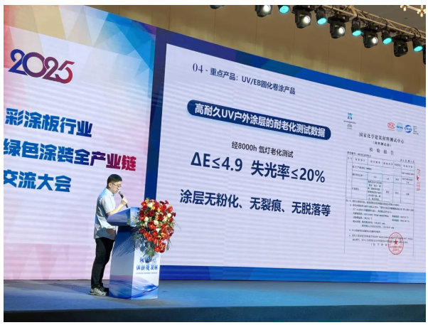 在產品應用與開發部分,他主要介紹了超高耐候樹脂和高耐久UV戶外涂層兩款重點產品:超高耐候樹脂7050擁有超強耐候性能,3000小時氙燈照射失光率僅為2.6%;高耐久UV戶外涂層經8000小時氙燈老化測試,結果顯示?E≤4.9.失光率≤20%,涂層無粉化、無裂痕、無脫落等現象。