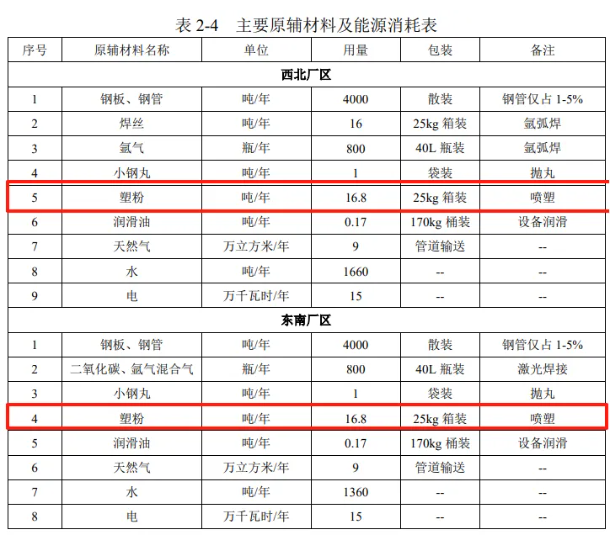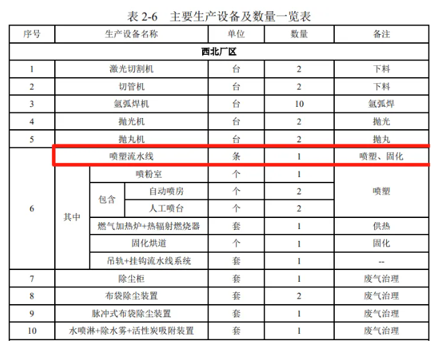 本項(xiàng)目西北廠區(qū)、東南廠區(qū)各設(shè)置1條噴塑流水線,每條噴塑流水線配備2個(gè)自動(dòng)噴房(1用1備,各配備8把噴槍)、2個(gè)手動(dòng)噴臺(tái)(1用1備,各配備1把噴槍)。根據(jù)建設(shè)單位提供資料,本項(xiàng)目西北廠區(qū)、東南廠區(qū)噴塑面積均約為 120000m2;其中,自動(dòng)噴房主要噴涂產(chǎn)品的主體,噴塑面積約占總噴塑面積的95%,則西北廠區(qū)、東南廠區(qū)自動(dòng)噴房的噴塑面積均約為114000m2;人工噴臺(tái)主要對(duì)產(chǎn)品進(jìn)行少量修補(bǔ),噴塑面積約占總噴塑面積的5%,則西北廠區(qū)、東南廠區(qū)人工噴臺(tái)的噴塑面積均約為6000m2.