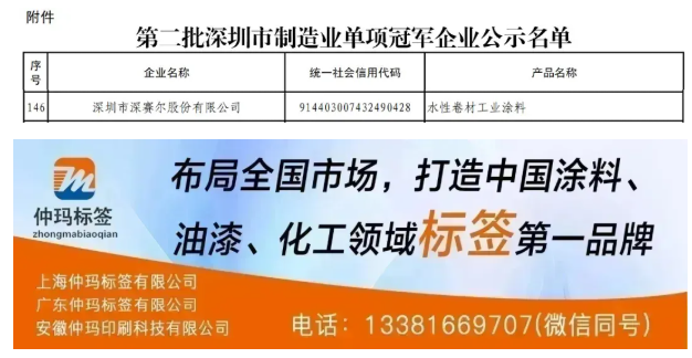 近日,深圳市工業和信息化局組織遴選的第二批深圳市制造業單項冠軍企業名單揭曉,深圳市深賽爾股份有限公司憑借在水性卷材工業涂料領域的市場占有率及行業影響力,正式入選深圳市制造業單項冠軍名單,同時也是本次唯一入選的涂料企業。