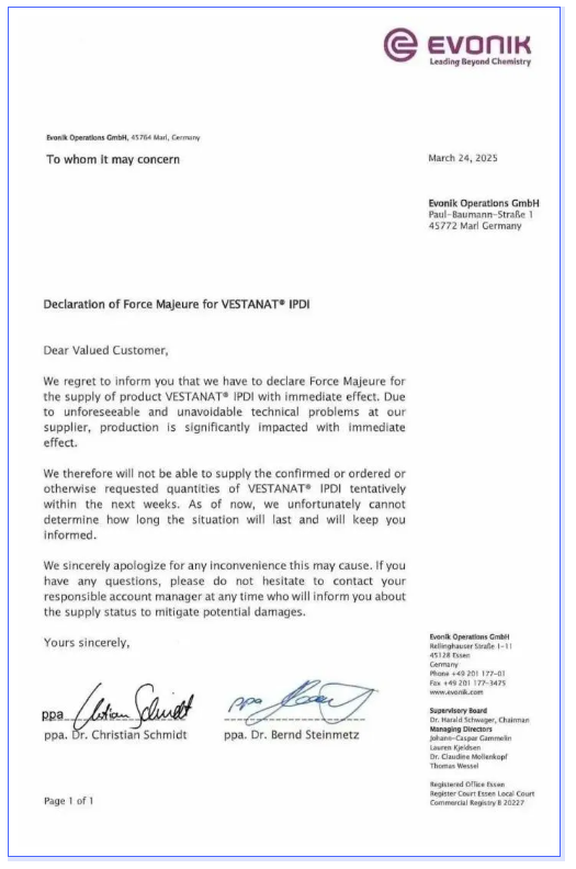 2025年3月,贏創發布了關于VESTANAT®IPDI的不可抗力聲明,由于其供應商處出現技術問題,對生產產生直接影響,對IPDI產品的供應宣布不可抗力。