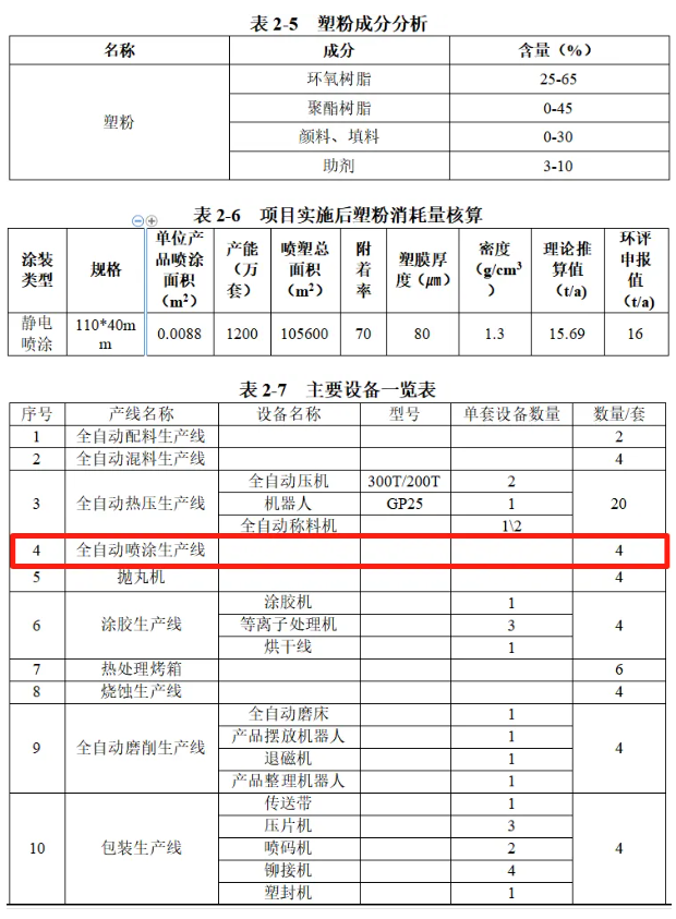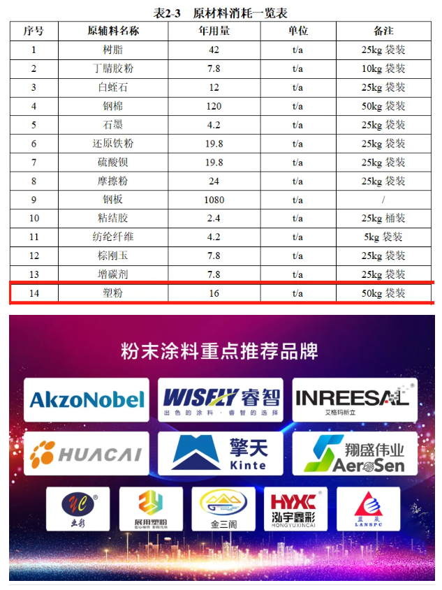 根據(jù)公開(kāi)信息顯示,該項(xiàng)目配備了4條全自動(dòng)噴涂線,年消耗塑粉16噸,塑粉成分分析及消耗量核算情況如下表示所示: