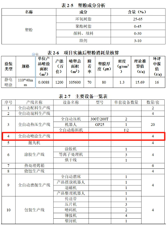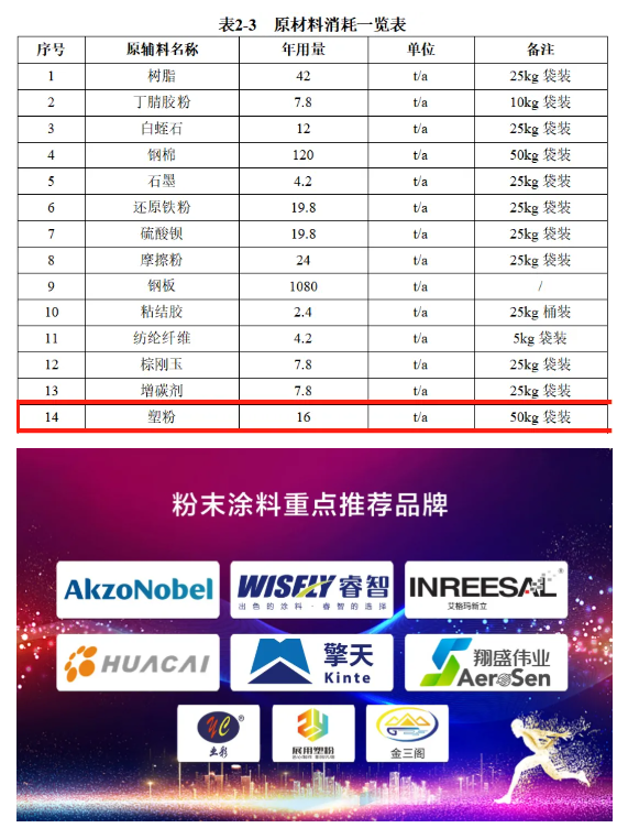 根據公開信息顯示,該項目配備了4條全自動噴涂線,年消耗塑粉16噸,塑粉成分分析及消耗量核算情況如下表示所示: