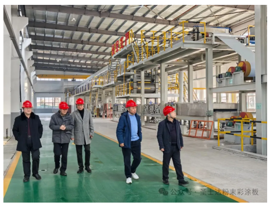 在圣士達董事長刁書才及技術團隊的引領下,尹敏達副會長一行深入靜電粉末彩涂板生產車間,細致觀察了從基板預處理、粉末噴涂直至高溫固化的每一步工藝環節。圣士達技術總監親自展示了產品的耐腐蝕、抗刮擦及環保特性,并著重闡述了公司獨創的“低溫固化技術”與“無鉻鈍化工藝”在業界的領先地位。